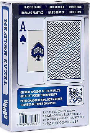 O baralho texas hold'em copag é um baralho de poker que foi especialmente desenvolvido pela copag, para jogar poker. Internacionalmente conhecido, é um baralho de plástico produzido em pvc de alta qualidade, que garante grande durabilidade e agradável manuseio.