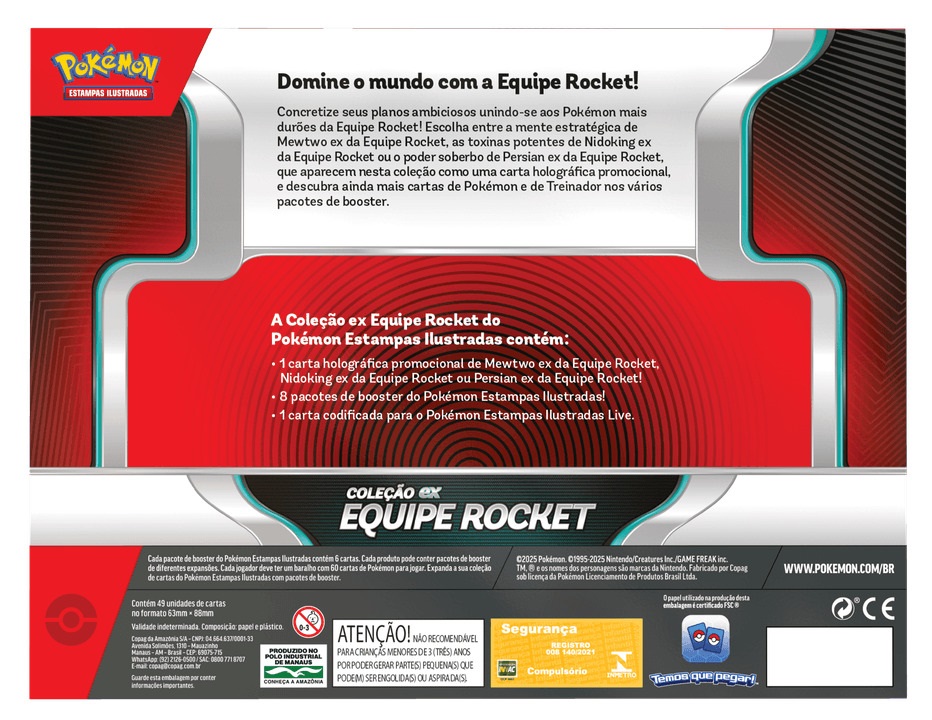 Escolha entre a mente estratégica de mewtwo ex da equipe rocket, as toxinas potentes de nidoking ex da equipe rocket ou o poder soberbo de persian ex da equipe rocket, que aparecem nesta coleção como uma carta holográfica promocional, e descubra ainda mais cartas de pokémon e de treinador nos vários pacotes de booster.