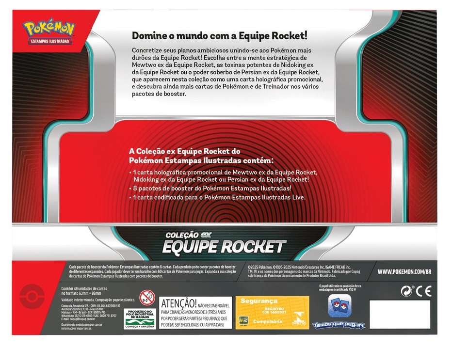 Escolha entre a mente estratégica de mewtwo ex da equipe rocket, as toxinas potentes de nidoking ex da equipe rocket ou o poder soberbo de persian ex da equipe rocket, que aparecem nesta coleção como uma carta holográfica promocional, e descubra ainda mais cartas de pokémon e de treinador nos vários pacotes de booster.